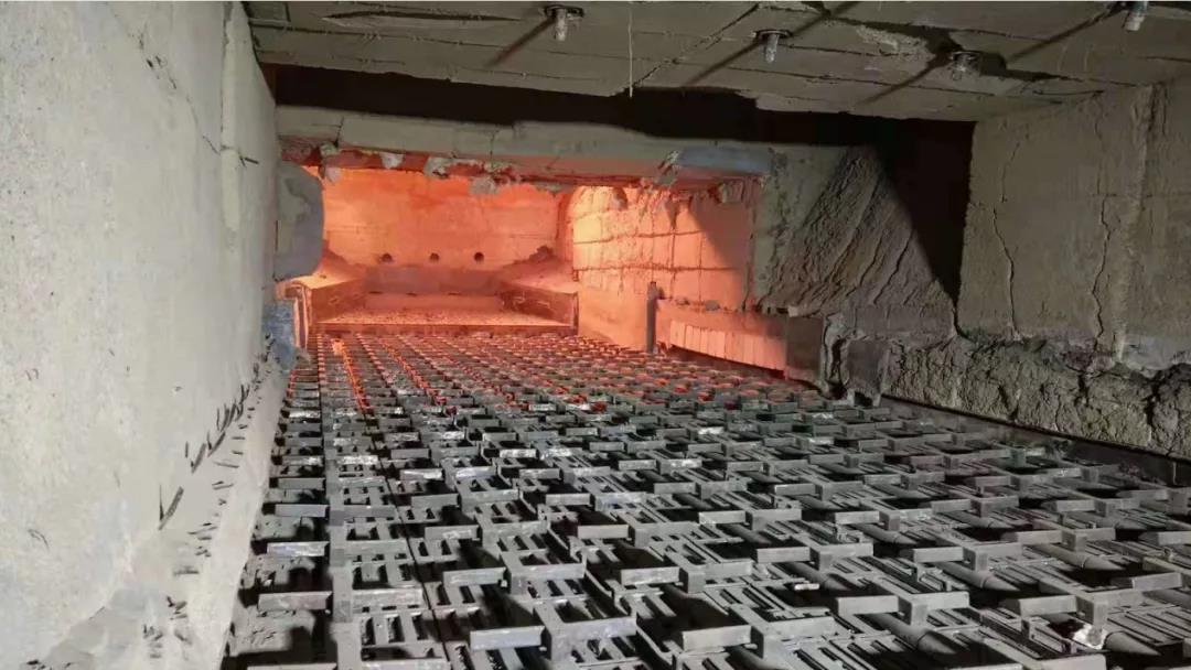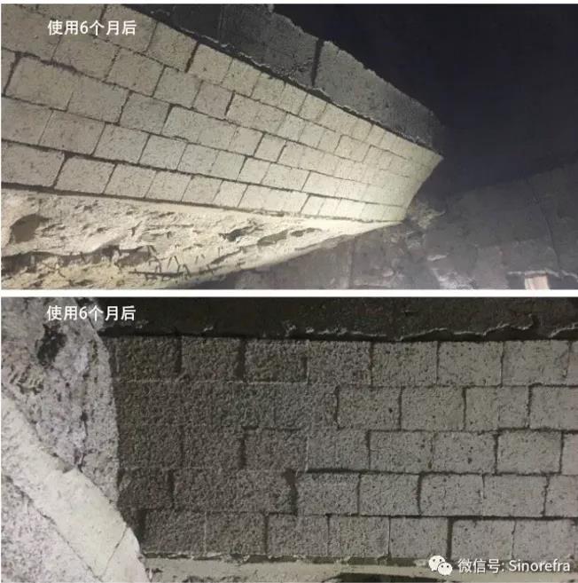 據了解,這一問題的“癥結”在于篦冷機喉部襯體的“特殊性”。篦冷機喉部通常選擇莫來石質高耐磨澆注料作為襯體材料,該位置煙氣含塵量高,煙氣中熟料顆粒硬度大,風速高,對襯體的沖刷磨損嚴重。部分結構特殊的篦冷機,還易產生較大的結構應力,引起襯體的開裂,熱煙氣沿裂縫進入襯體內部,造成襯體損壞,導致喉部超溫或殼體燒穿。在傳統(tǒng)的施工過程中,喉部頂部有混凝土水泥梁存在,空間狹小,施工比較困難,施工質量很難得到保證,襯體內部含水量加大,在點火升溫過程中喉部襯體很容易爆裂。因此,篦冷機喉部襯體使用壽命普遍偏低,甚至有的只有3-4個月的壽命,嚴重影響了水泥窯的正常安全運行?,F在,大多數企業(yè)為了減少現場施工工序復雜對質量和進度的影響,多已采用預制成形的耐火預制件產品作為襯體材料。預制件在篦冷機喉部的使用,大幅度提高了喉部襯體的強度和耐磨性能,避免了爆裂的風險,延長的喉部襯體的使用壽命。據水泥人網了解,冀東合川、冀東璧山、葛洲壩當陽、華沃水泥(棗莊)等公司都選用了通達耐火的篦冷機喉部預制件產品。據企業(yè)負責人介紹,其產品以優(yōu)質莫來石和碳化硅為主要原料,成型后經過1200℃高溫燒成制取。實現了不定形產品的靈活性和定形產品的穩(wěn)定性的有機結合,具有質量穩(wěn)定、形式簡單、施工方便和結構穩(wěn)定的特點。其使用效果明顯優(yōu)于現場澆注的襯體。華沃水泥(棗莊)喉部預制件使用8個月后,預制件表面僅有輕微侵蝕,體現出喉部預制件優(yōu)異的抗堿侵蝕性能。