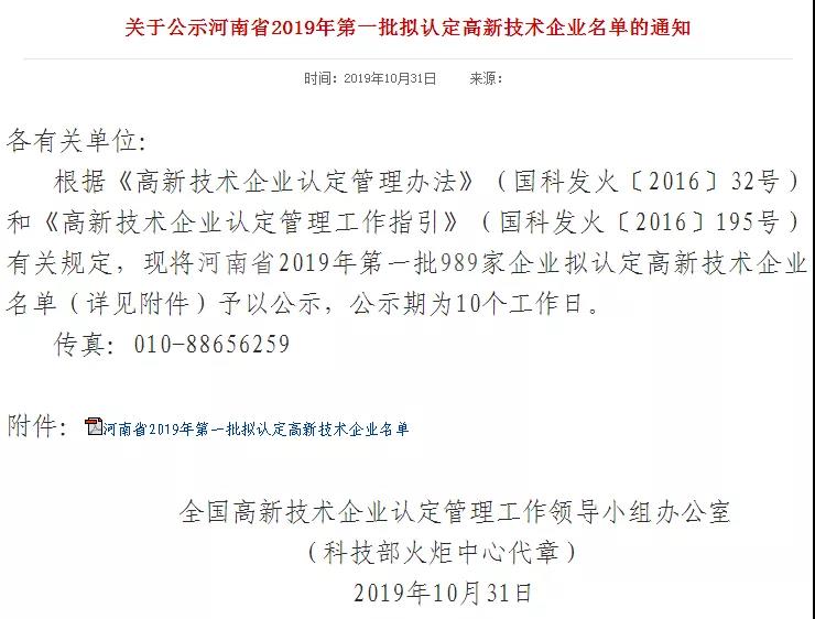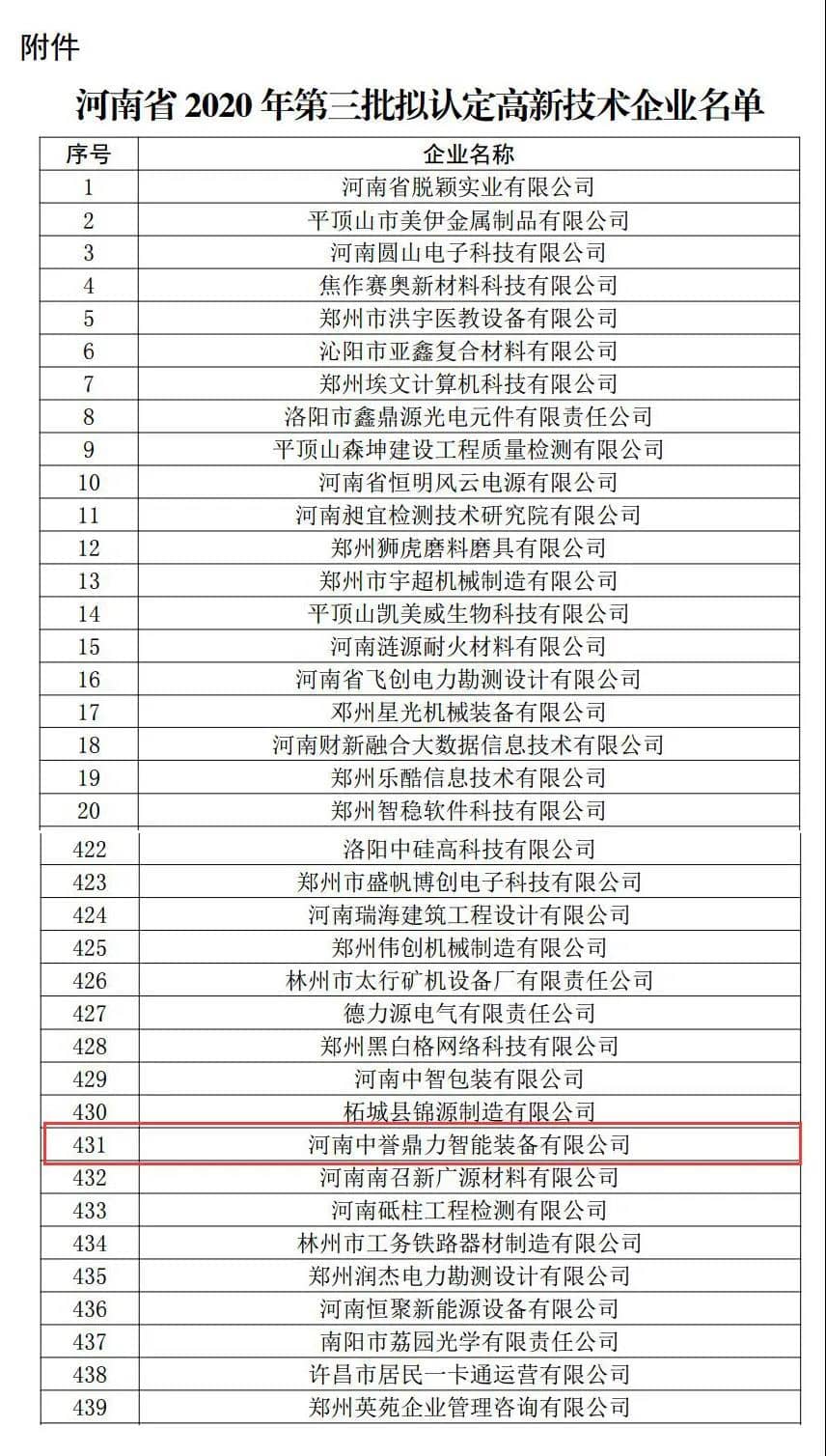根據(jù)國家《高新技術(shù)企業(yè)認(rèn)定管理辦法》(國科發(fā)火〔2016〕32號)和《高新技術(shù)企業(yè)認(rèn)定管理工作指引》(國科發(fā)火〔2016〕195號)有關(guān)規(guī)定,全國高新技術(shù)企業(yè)認(rèn)定管理工作領(lǐng)導(dǎo)小組辦公室12月初在官方網(wǎng)站對河南省2020年第三批擬認(rèn)定高新技術(shù)企業(yè)名單進(jìn)行公示。經(jīng)過為期10天的公示階段,河南中譽(yù)鼎力智能裝備有限公司順利通過“國家高新技術(shù)企業(yè)”認(rèn)定。