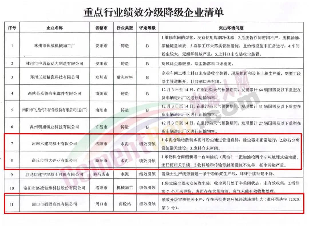 12月17日,省污染防治攻堅(jiān)辦印發(fā)通報(bào),對部分重點(diǎn)行業(yè)績效分級企業(yè)實(shí)施降級處理。通報(bào)指出,11月份以來,省秋冬季大氣污染防治攻堅(jiān)暗訪檢查發(fā)現(xiàn),6家績效分級B級企業(yè)和5家績效引領(lǐng)企業(yè),存在治污設(shè)施不正常運(yùn)行、無組織排放嚴(yán)重、管控措施落實(shí)不力及在重污染天氣預(yù)警期間違規(guī)使用國四及以下車輛等環(huán)境突出問題。經(jīng)省污染防治攻堅(jiān)戰(zhàn)領(lǐng)導(dǎo)小組辦公室研究決定,取消上述6家績效分級B級企業(yè)資格,降為C級企業(yè);取消上述5家績效引領(lǐng)企業(yè)資格。