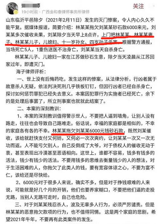 在評論區(qū)有知情人透露,這樣一起惡性案件源于6000元的要賬,死者一家分別是年逾五旬的夫婦、兒子兒媳,孫子孫女,相當(dāng)于一家6口滅門。犯罪嫌疑人自己也已經(jīng)自殺身亡。