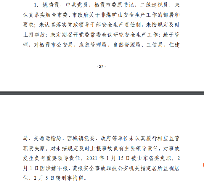 姚秀霞,棲霞市委原書記,二級巡視員。未認(rèn)真落實煙臺市委、市政府關(guān)于非煤礦山安全生產(chǎn)工作的部署和要求;未認(rèn)真落實黨政領(lǐng)導(dǎo)干部安全生產(chǎn)責(zé)任制,未按規(guī)定及時上報事故;未定期召開黨委常委會議研究安全生產(chǎn)工作;疏于管理,對棲霞市公安局、應(yīng)急管理局、自然資源局、工信局、住建局、交通運輸局、西城鎮(zhèn)黨委、政府等單位未認(rèn)真履行相應(yīng)監(jiān)管職責(zé)失察。對未按規(guī)定及時上報事故負(fù)有主要領(lǐng)導(dǎo)責(zé)任,對事故發(fā)生負(fù)有重要領(lǐng)導(dǎo)責(zé)任。2021年1月15日被山東省委免職。2月1日因涉嫌不報、謊報安全事故罪被公安機關(guān)指定居所監(jiān)視居住,2月5日轉(zhuǎn)刑事拘留。