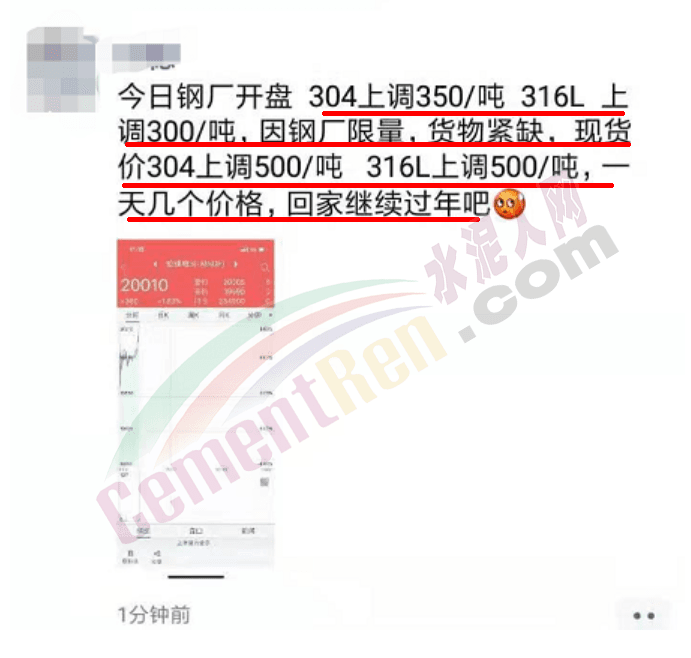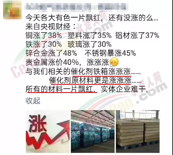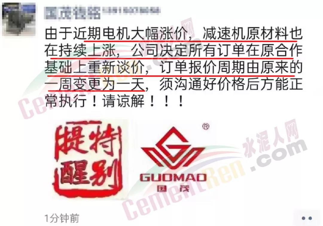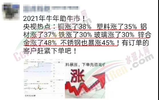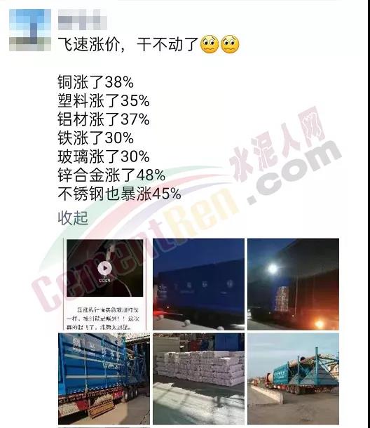 近日,水泥行業(yè)的上游供應(yīng)商“炸鍋了”,設(shè)備供應(yīng)商“漲價(jià)函”滿(mǎn)天飛,只因?yàn)椋恒~漲了38%、塑料漲了35%、鋁材漲了37%、鐵漲了30%、玻璃漲了30%、鋅合金漲了48%、不銹鋼也暴漲45%。