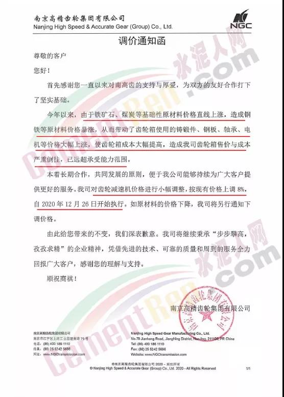 在剛剛過(guò)去的春節(jié)長(zhǎng)假,大宗商品市場(chǎng)頗不平靜,油脂類(lèi)產(chǎn)品也出現(xiàn)大幅的大調(diào)。南京高精齒輪集團(tuán)有限公司調(diào)價(jià)通知稱(chēng),今年以來(lái),由于鐵礦石、煤炭等基礎(chǔ)性原材料價(jià)格直線(xiàn)上漲,造成鋼鐵等原材料價(jià)格暴漲,從而帶動(dòng)了齒輪箱使用的鑄鍛件、鋼板、軸承、電機(jī)等價(jià)格大幅上漲,使齒輪箱成本大幅提高,造成公司齒輪箱售價(jià)與成本嚴(yán)重倒掛,已遠(yuǎn)超承受能力范圍。本著長(zhǎng)期合作,共同發(fā)展的原則,便于公司能夠持續(xù)為廣大客戶(hù)提供更好的服務(wù)。對(duì)齒輪減速機(jī)價(jià)格進(jìn)行小幅調(diào)整,按現(xiàn)有價(jià)格上調(diào)8%,自2020年12月26日開(kāi)始執(zhí)行。如原材料的價(jià)格下降,將另行通知下調(diào)價(jià)格。