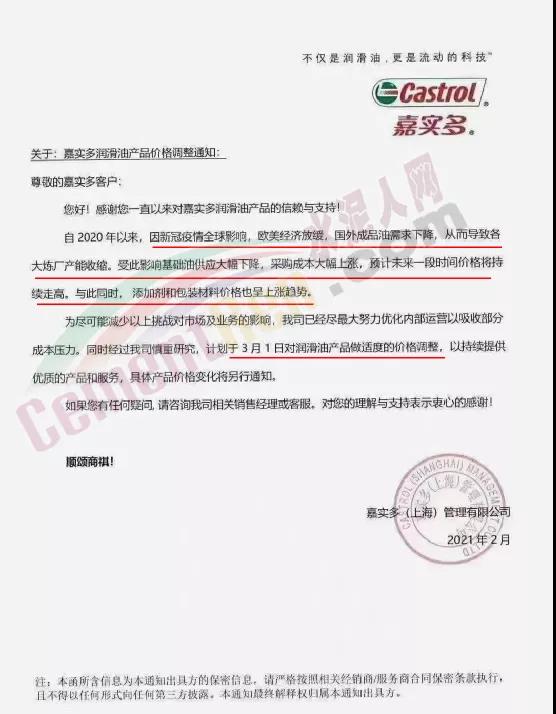 嘉實(shí)多潤(rùn)滑油產(chǎn)品價(jià)格調(diào)整通知稱(chēng),自2020年以來(lái),因新冠疫情全球影響,歐美經(jīng)濟(jì)放緩,國(guó)外成品油需求下降,從而導(dǎo)致各大煉廠(chǎng)產(chǎn)能收縮。受此影響基礎(chǔ)油供應(yīng)大幅下降,采購(gòu)成本大幅上漲,預(yù)計(jì)未來(lái)一段時(shí)間價(jià)格將持續(xù)走高。與此同時(shí),添加劑和包裝材料價(jià)格也呈上漲趨勢(shì)。