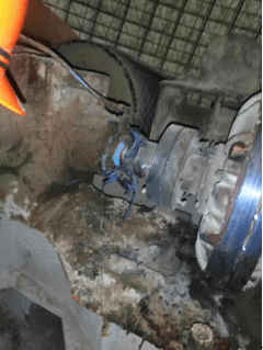 A線均化庫為半球形鋼結構,直徑120米,高37米,均化庫大門朝北,距均化庫大門18.6米處為堆取料機,事發(fā)地點位于堆取料機減速機平臺內(長2.4米,寬0.8米,整體高度為1.6米),由西至東分別為減速器(長0.7米,寬0.55米)、電磁離合器(長0.8米,直徑為0.45米,距平臺底部間隙為0.1米)和取料減速電機(長0.9米,寬0.8米)(如圖四)?,F(xiàn)場勘查發(fā)現(xiàn)與電磁離合器傳動部位脫離的拱形防護罩(寬0.3米,高0.35米)在減速機平臺底部西北側。平臺上電磁離合器傳動部位可見明顯血跡,電磁離合器傳動軸連接處可見衣物碎片(如圖五)。