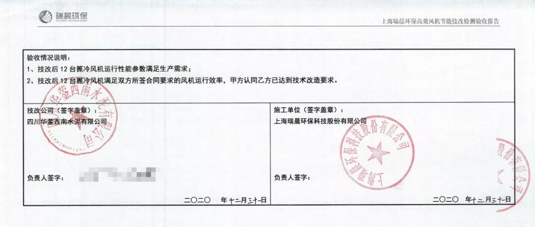經(jīng)瑞晨環(huán)保改造后,華鎣西南12臺(tái)高效篦冷風(fēng)機(jī)2608-2619運(yùn)行穩(wěn)定,經(jīng)第三方(綿陽(yáng)旗諾)檢測(cè),運(yùn)行效率分別高達(dá)83.30%、84.10%、83.90%、83.90%、84.10%、83.70%、85.60%、84.70%、83.50%、86.80%、85.40%、85.30%,并在熟料提產(chǎn)至6560t/d后12臺(tái)高效篦冷風(fēng)機(jī)噸熟料電耗降低至4.13kWh/t,篦冷機(jī)系統(tǒng)噸熟料電耗降低至4.30kWh/t,滿足技術(shù)合同約定的篦冷機(jī)系統(tǒng)噸熟料電耗≤4.73kWh/t。瑞晨環(huán)保高效篦冷風(fēng)機(jī)配合成都院配套IKN第四代篦冷床的升級(jí)換代項(xiàng)目完美驗(yàn)收,瑞晨環(huán)保高效篦冷風(fēng)機(jī)得到成都院與四川華鎣西南水泥有限公司各層領(lǐng)導(dǎo)以及西南水泥高層的高度認(rèn)可與一致好評(píng)。