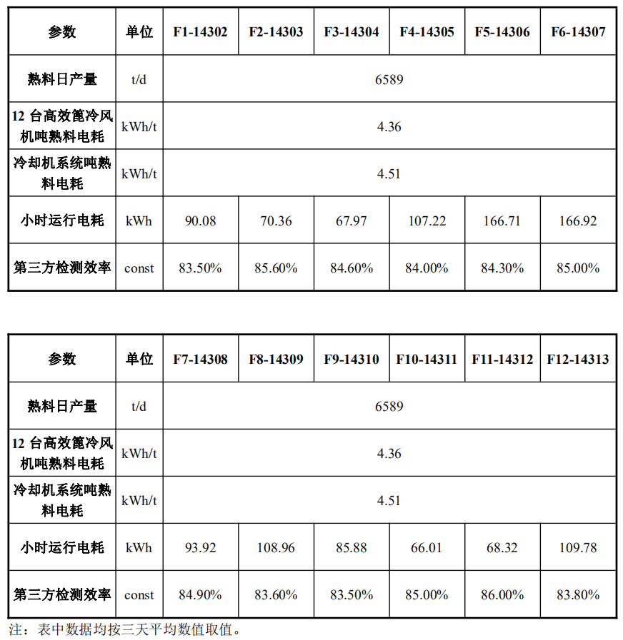 經(jīng)瑞晨環(huán)保改造后,四川國(guó)大12臺(tái)高效篦冷風(fēng)機(jī)F1-14302~F12-14313運(yùn)行穩(wěn)定,經(jīng)過(guò)第三方(綿陽(yáng)旗諾)標(biāo)定,運(yùn)行效率分別高達(dá)83.50%、85.60%、84.60%、84.00%、84.30%、85.00%、84.90%、83.60%、83.50%、85.00%、86.00%、83.80%。熟料提產(chǎn)至6589t/d后,12臺(tái)高效篦冷風(fēng)機(jī)噸熟料電耗降低至4.36kWh/t,篦冷機(jī)系統(tǒng)熟料電耗降低至4.51kWh/t滿足技術(shù)合同約定的噸熟料電耗≤4.93kWh/t。