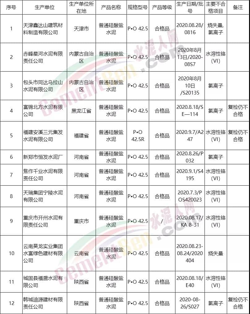 山東省市場監(jiān)督管理局2020年水泥產(chǎn)品質(zhì)量省級(jí)監(jiān)督抽查結(jié)果, 發(fā)現(xiàn)4家企業(yè)的4批次PO42.5產(chǎn)品不符合相關(guān)標(biāo)準(zhǔn)的要求,不合格項(xiàng)目為氯離子、燒失量、水溶性鉻(VI)等項(xiàng)目。