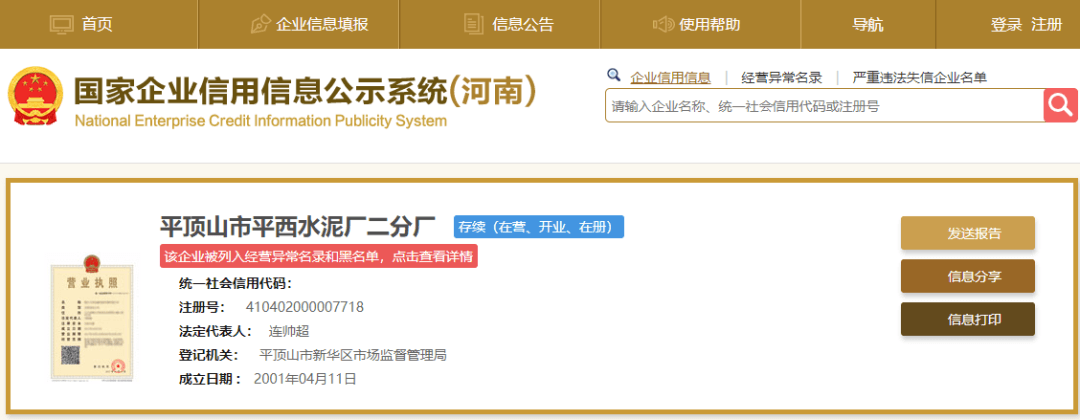 經(jīng)查,平頂山市平西水泥廠二分廠(統(tǒng)一社會(huì)信用代碼/注冊(cè)號(hào):410402000007718)因被列入經(jīng)營異常名錄屆滿3年仍未履行相關(guān)義務(wù),違反了《企業(yè)信息公示暫行條例》的有關(guān)規(guī)定且情節(jié)嚴(yán)重。依據(jù)《嚴(yán)重違法失信企業(yè)名單管理暫行辦法》第五條第一款第(一)項(xiàng)的規(guī)定,河南省市場(chǎng)監(jiān)督管理局現(xiàn)決定將平頂山市平西水泥廠二分廠列入嚴(yán)重違法失信企業(yè)名單,并通過國家企業(yè)信用信息公示系統(tǒng)向社會(huì)公示。