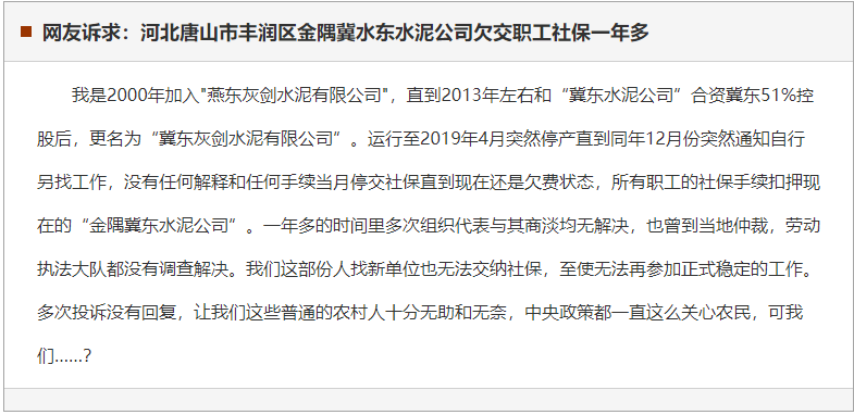 日前,有網(wǎng)友在河北新聞網(wǎng)陽(yáng)光理政平臺(tái)上留言表示自己原是冀東灰劍水泥有限公司員工,后因企業(yè)停產(chǎn),要求其另行找工作,目前社保手續(xù)被扣押,無(wú)法繼續(xù)交納社保,故而求助相關(guān)部門。