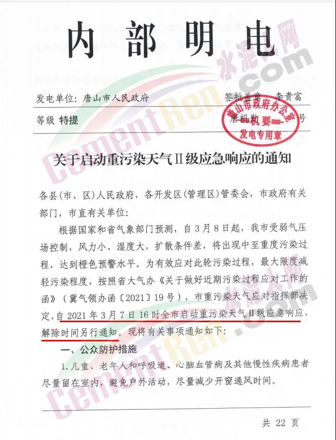 日前,唐山市人民政府發(fā)布特提文件《關(guān)于啟動(dòng)重污染天氣級(jí)應(yīng)急響應(yīng)的通知》:要求自2021年3月7日16時(shí)全市啟動(dòng)重污染天氣Ⅱ級(jí)應(yīng)急響應(yīng),解除時(shí)間另行通知。水泥、鋼鐵、焦化等企業(yè)執(zhí)行強(qiáng)制性減排措施: