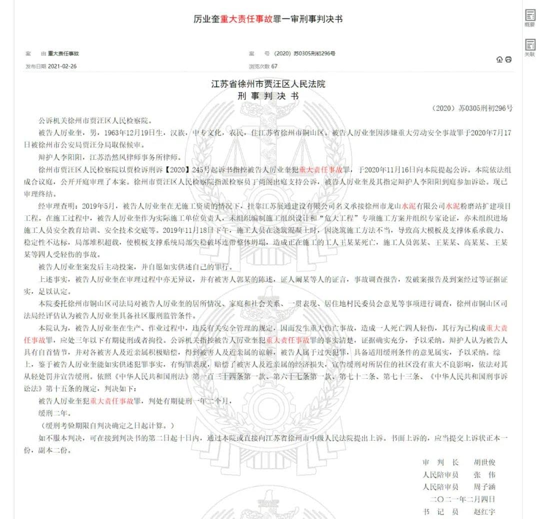 2021年2月26日,中國裁判文書網(wǎng)發(fā)布了關(guān)于這起事故的一審刑事判決書,掛靠的實際施工負(fù)責(zé)人被判處有期徒刑一年二個月。