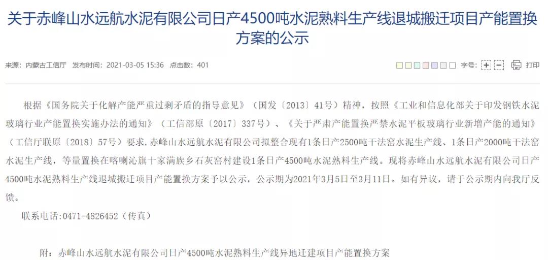 3月5日,內(nèi)蒙古工信廳也發(fā)布了一條《關(guān)于赤峰山水遠航水泥有限公司日產(chǎn)4500噸水泥熟料生產(chǎn)線退城搬遷項目產(chǎn)能置換方案的公示》。公示內(nèi)容為:赤峰山水遠航水泥有限公司擬整合現(xiàn)有1條日產(chǎn)2500噸干法窯水泥生產(chǎn)線、1條日產(chǎn)2000噸干法窯水泥生產(chǎn)線,等量置換在喀喇沁旗十家滿族鄉(xiāng)石灰窯村建設1條日產(chǎn)4500噸水泥熟料生產(chǎn)線。