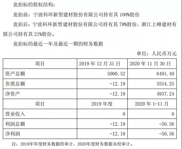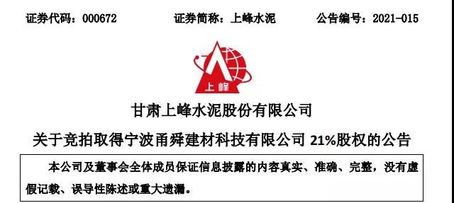 上峰水泥上市公司3月8日發(fā)布公告稱:近日,公司全資子公司浙江上峰建材有限公司,以1041.12萬元競拍取得寧波科環(huán)新型建材股份有限公司在寧波產(chǎn)權(quán)交易中心公開掛牌轉(zhuǎn)讓其持有的寧波甬舜建材科技有限公司21%的股權(quán)。交易完成后,寧波科環(huán)持有甬舜建材79%股份,上峰建材持21%的股份。