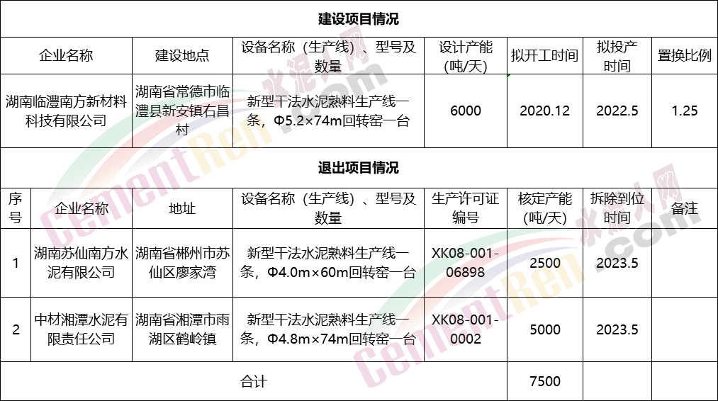 淘汰的產(chǎn)能來自郴州市的湖南蘇仙南方水泥有限公司,2500t/d生產(chǎn)線一條;中材湘潭水泥有限責任公司,5000t/d生產(chǎn)線一條,拆除時間都是2023年5月。
