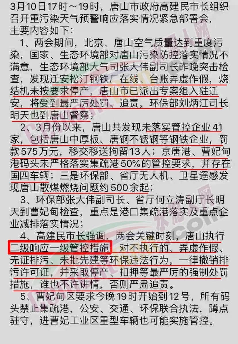 據(jù)水泥人網(wǎng)了解,經(jīng)銷商提到的“紅色預(yù)警”是指,3月10日17時(shí)~19時(shí),唐山市政府高建民市長(zhǎng)組織召開重污染天氣預(yù)警響應(yīng)落實(shí)情況緊急部署會(huì)時(shí)提到的“唐山執(zhí)行二級(jí)響應(yīng)一級(jí)管控措施”要求。