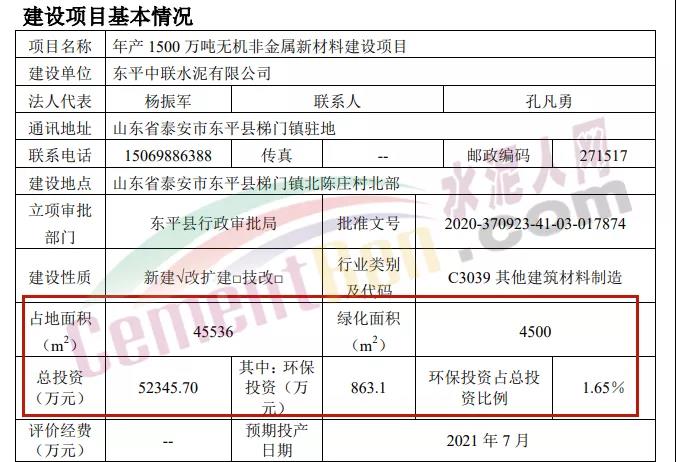 據(jù)水泥人網(wǎng)了解,東平中聯(lián)水泥有限公司無機(jī)非金屬新材料建設(shè)項(xiàng)目位于山東省泰安市東平縣梯門鎮(zhèn)北陳莊村北部,總投資 52345.70 萬元,其中環(huán)保投資 863.1 萬元,占總投資比例的1.65%,項(xiàng)目占地面積 45536平方米,綠化面積4500平方米。預(yù)計(jì)投產(chǎn)日期為2021年7月。