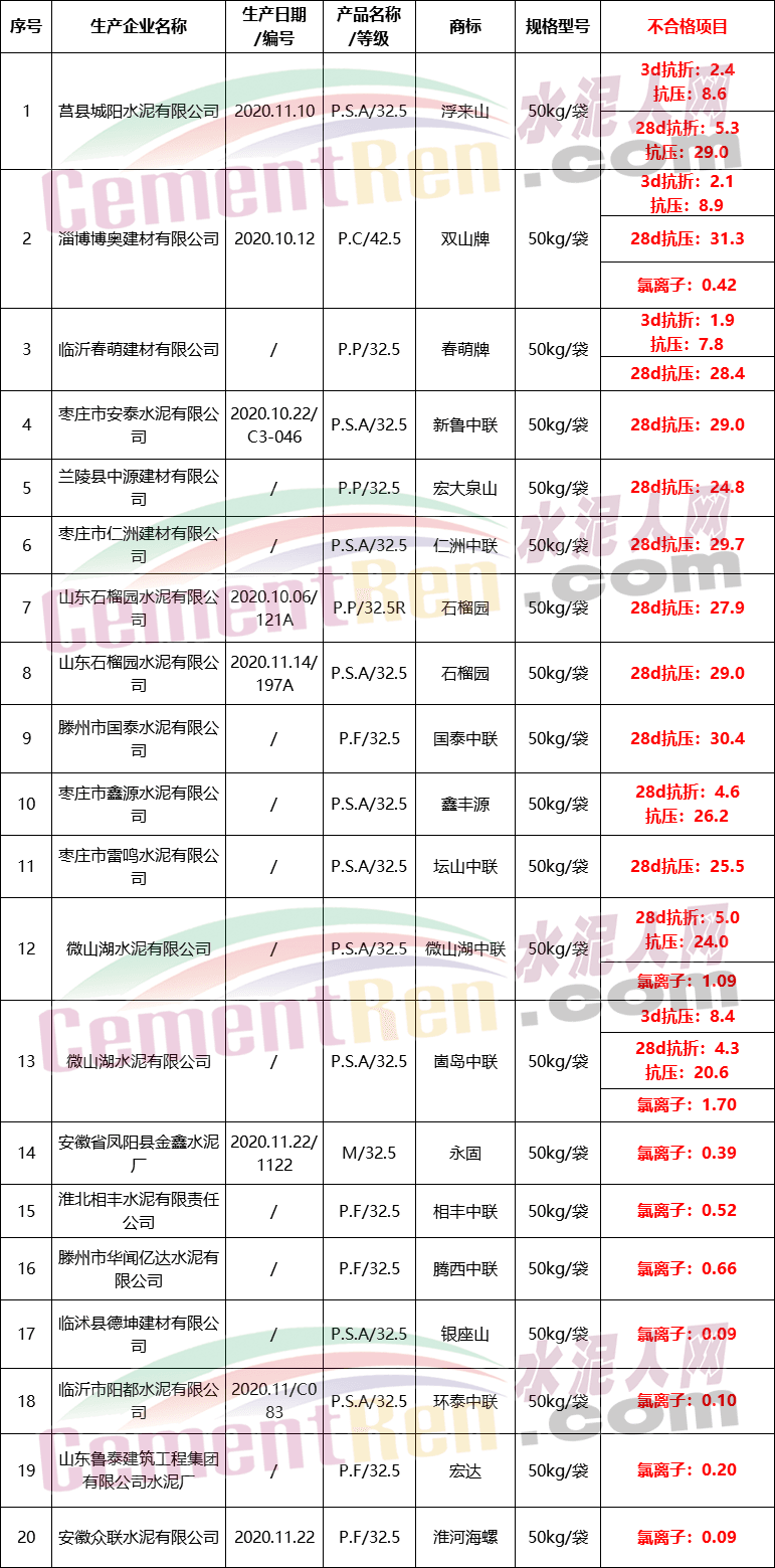 經(jīng)檢測,共檢出不合格水泥20批次,不合格率高達(dá)23.5%。其中抗壓、抗折強(qiáng)度不合格13個批次,氯離子含量超標(biāo)不合格10個批次,不合格項目及批次為: