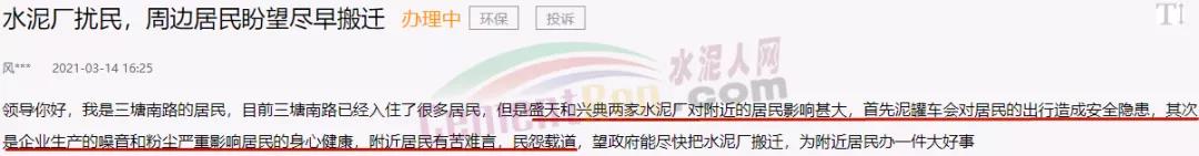 據(jù)水泥人網(wǎng)了解,上述兩家企業(yè)一家為水泥制品工廠,一家為商品混凝生產(chǎn)企業(yè)。且早在2020年5月27日,就有網(wǎng)友在人民網(wǎng)地方留言板給興寧區(qū)委書(shū)記留言稱(chēng),三塘南路盛天水泥24小時(shí)不間斷施工,噪音大、揚(yáng)塵多,業(yè)主不敢開(kāi)窗。而且,混凝土車(chē)輛多,周邊道路沒(méi)有很好的提示標(biāo)志 ,道路兩側(cè)隔離帶種植樹(shù)木遮擋拐彎視線,車(chē)輛在此處極容易發(fā)生交通事故。