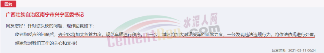 2021年3月11日廣西壯族自治區(qū)南寧市興寧區(qū)委書(shū)記回應(yīng)稱(chēng)興寧區(qū)將加大監(jiān)管力度,規(guī)范車(chē)輛通行秩序。下一步,城區(qū)將加大對(duì)泥頭車(chē)的監(jiān)管力度,一經(jīng)發(fā)現(xiàn)違法違規(guī)行為,將依法依規(guī)進(jìn)行處置。