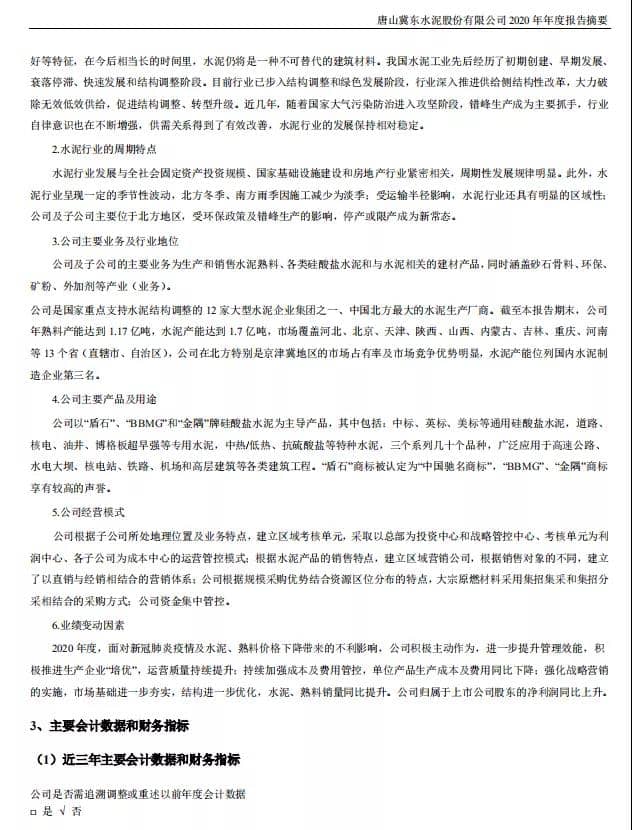 2020 年度,面對(duì)新冠肺炎疫情及水泥、熟料價(jià)格下降帶來(lái)的不利影響,公司積極主動(dòng)作為,進(jìn)一步提升管理效能,積極推進(jìn)生產(chǎn)企業(yè)“培優(yōu)”,運(yùn)營(yíng)質(zhì)量持續(xù)提升;持續(xù)加強(qiáng)成本及費(fèi)用管控,單位產(chǎn)品生產(chǎn)成本及費(fèi)用同比下降;強(qiáng)化戰(zhàn)略營(yíng)銷(xiāo)的實(shí)施,市場(chǎng)基礎(chǔ)進(jìn)一步夯實(shí),結(jié)構(gòu)進(jìn)一步優(yōu)化,水泥、熟料銷(xiāo)量同比提升。公司歸屬于上市公司股東的凈利潤(rùn)同比上升。