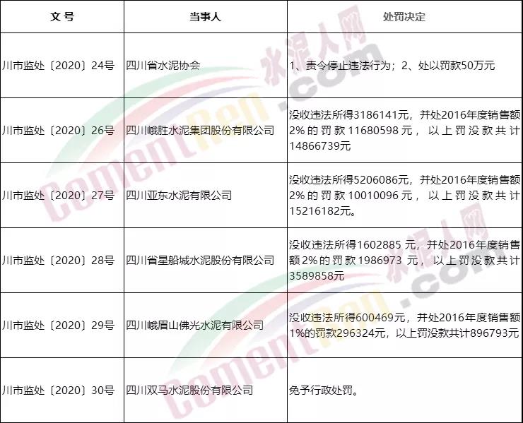 3月16日,四川省市場監(jiān)督管理局發(fā)布6條《行政處罰決定書》。其中針對(duì)于當(dāng)?shù)?a href="http://www.ifaga.cn/news/list_1.html" target="_blank" class="keylink">水泥行業(yè)的處罰決定書提到案件來源及調(diào)查經(jīng)過為:2017年7月,四川省發(fā)展和改革委員會(huì)從多個(gè)途徑收到反映四川省水泥協(xié)會(huì)組織本行業(yè)經(jīng)營者聯(lián)合漲價(jià)的舉報(bào)。經(jīng)初步核查后,四川省發(fā)展和改革委員會(huì)于2017年7月20日正式對(duì)四川省水泥協(xié)會(huì)及涉嫌達(dá)成并實(shí)施壟斷協(xié)議 的六家水泥經(jīng)營者予以立案調(diào)查。