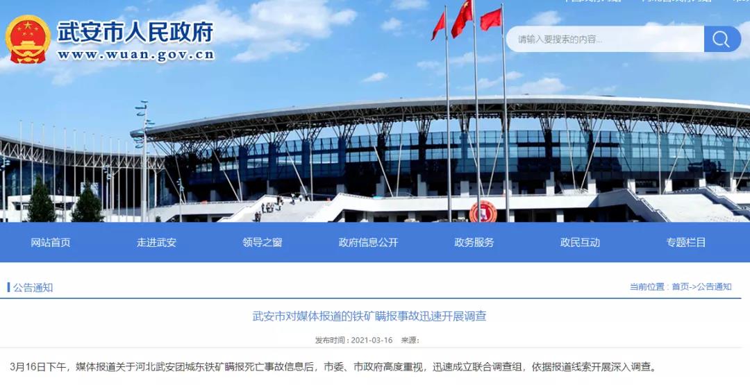 據(jù)武安市人民政府網(wǎng)站17日消息,2021年3月16日17時(shí)許,網(wǎng)曝“武安鐵礦疑似瞞報(bào)3人死亡事故”后,武安市委、市政府高度重視,按照省、邯鄲市要求,第一時(shí)間成立聯(lián)合核查組,依據(jù)報(bào)道線索深入開(kāi)展事故核查工作。經(jīng)初步核查,媒體反映的情況屬實(shí)。