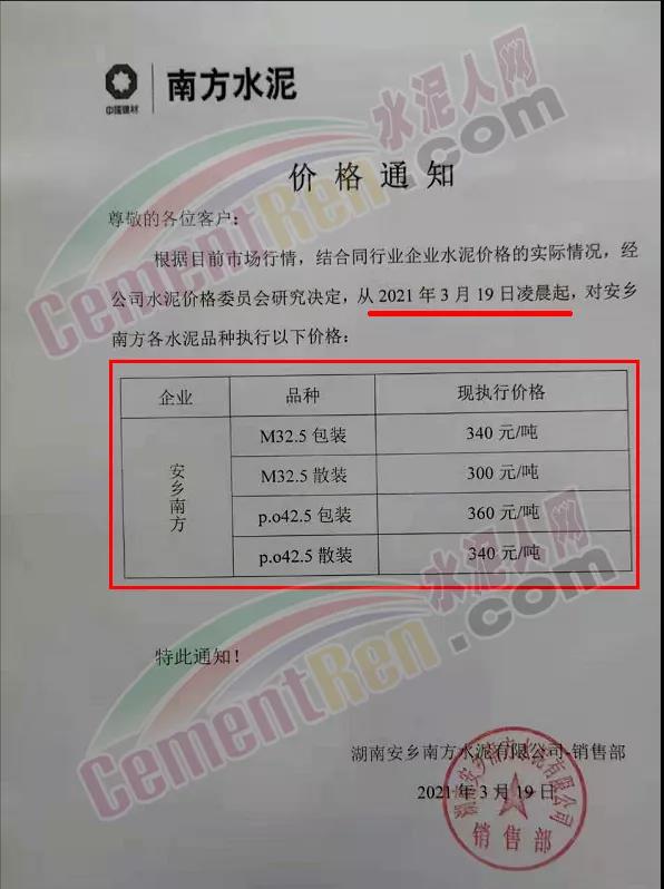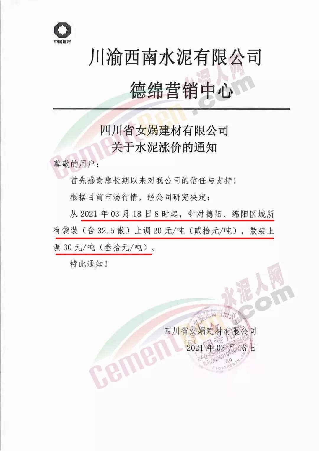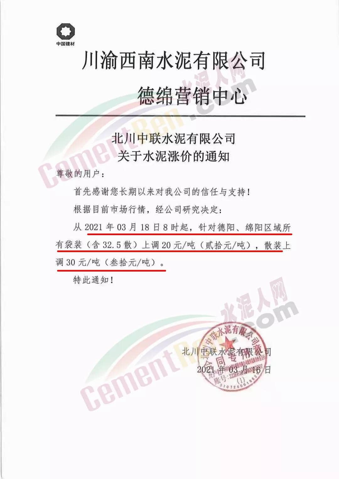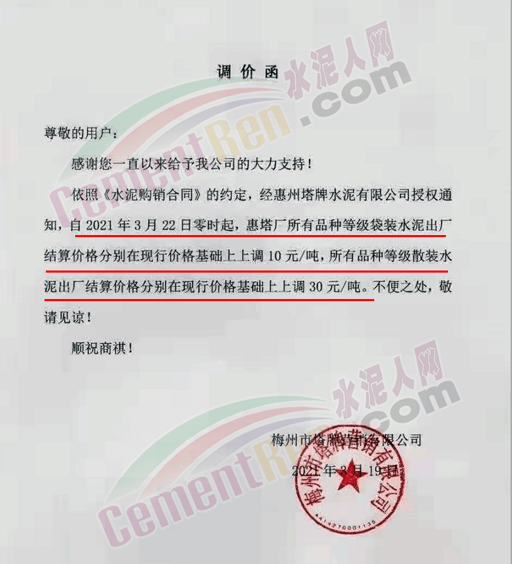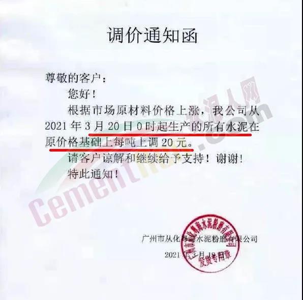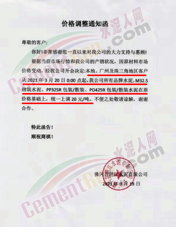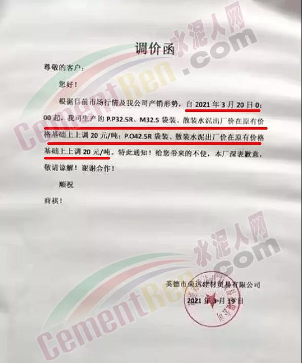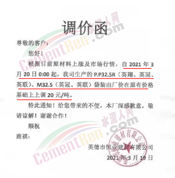 英德市恒亞建材有限公司通知根據(jù)目前原材料上漲及市場行情,自 2021年3月20日零點(diǎn)起,公司生產(chǎn)的P.P32.5R(英翔、英冠、英聯(lián))、M32.5(英冠、英聯(lián))袋裝出廠價(jià)在原有價(jià)格基礎(chǔ)上上調(diào) 20 元/噸。