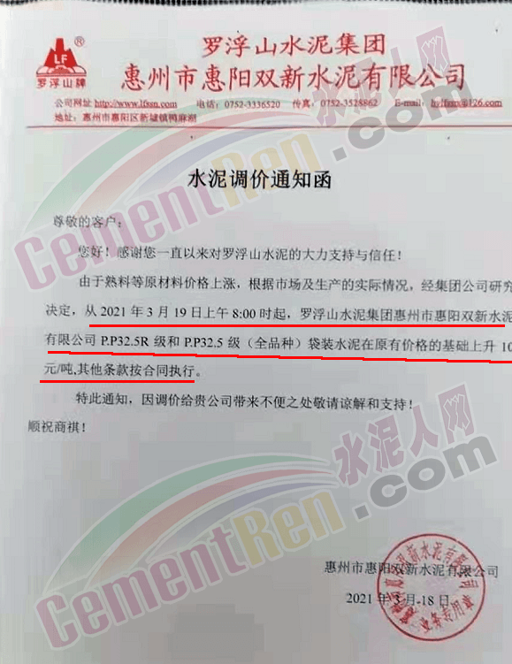 惠州市黃輝建材實(shí)業(yè)有限公司通知,因原材料市場價(jià)格變動,于2021年3月20日 0∶00 點(diǎn)起,本公司代理的 PP32.5R《英佛牌》、 PO42.5R《三蓮牌》、包裝水泥在原價(jià)基礎(chǔ)上上調(diào)20元/噸。