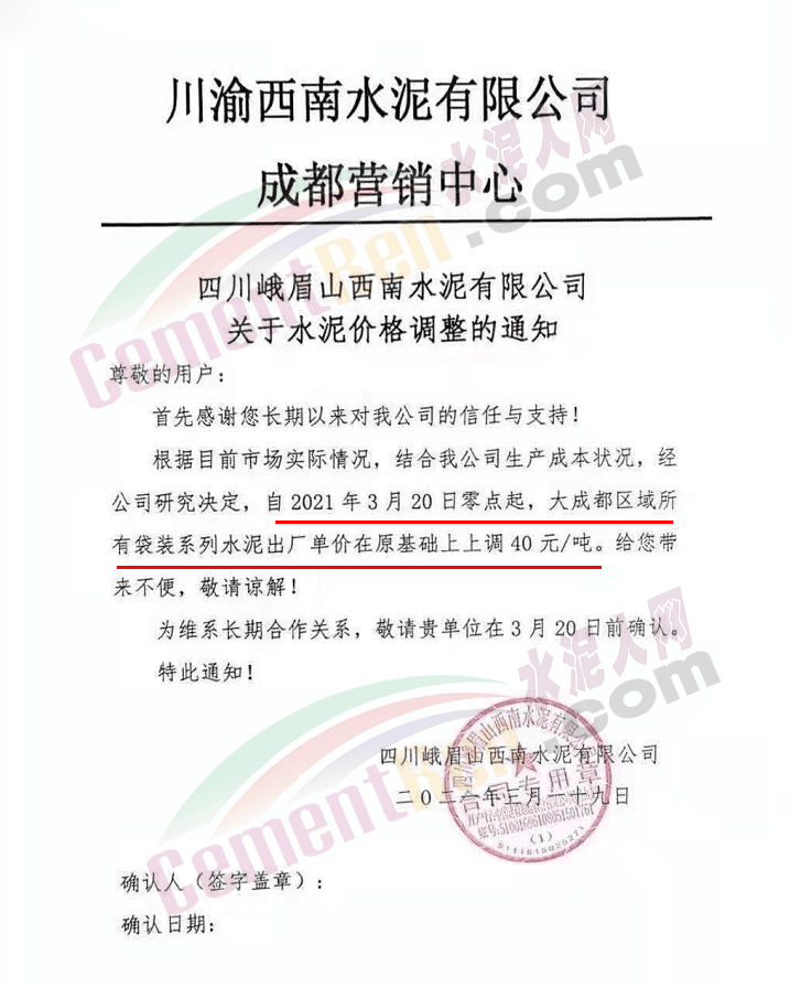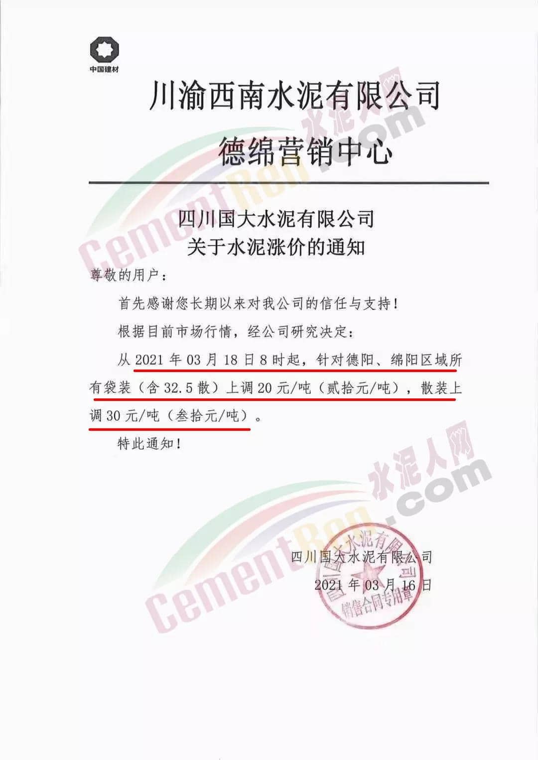 川渝西南水泥有限公司成都營銷中心,四川峨眉山西南水泥有限公司通知自今日(20日)零點(diǎn)起,大成都區(qū)域所有袋裝系列水泥出廠單價(jià)在原基礎(chǔ)上上調(diào)40元/噸。