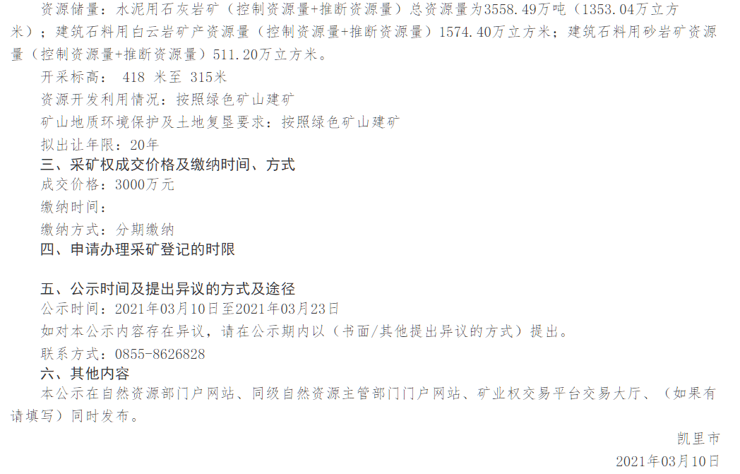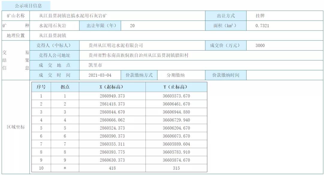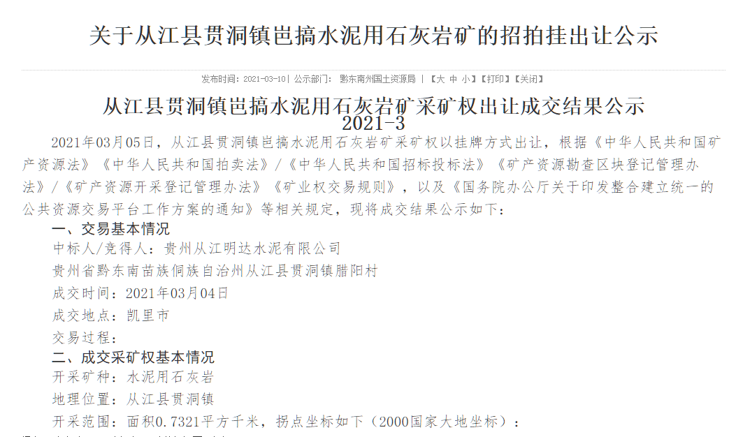 日前,自然資源部網(wǎng)站發(fā)布“從江縣貫洞鎮(zhèn)岜搞水泥用石灰?guī)r礦采礦權(quán)出讓成交結(jié)果公示”。公示顯示,貴州從江明達水泥有限公司以3000萬元拍得一處水泥用石灰?guī)r采礦權(quán)。