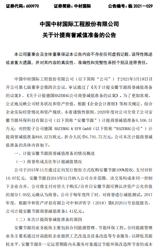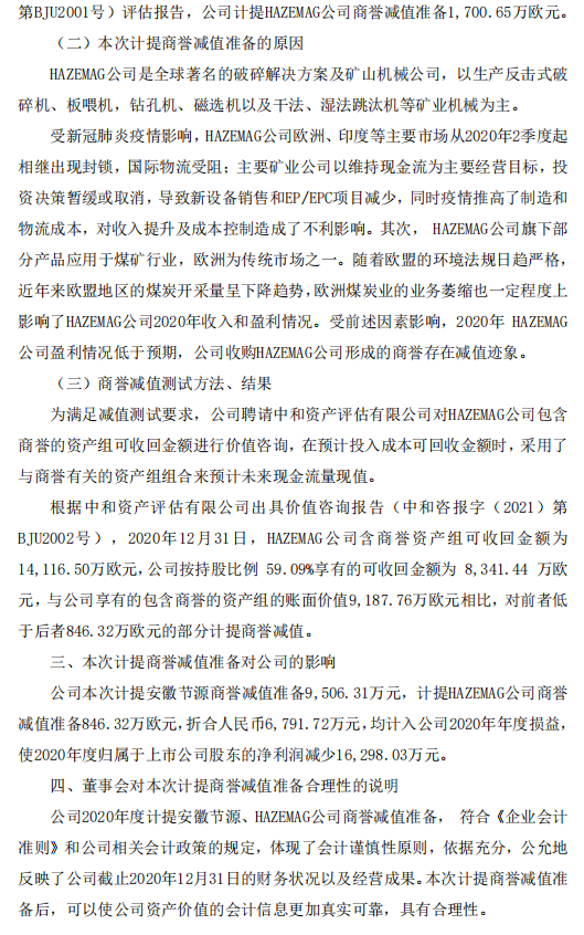 公司同期公告,公司對全資子公司安徽節(jié)源環(huán)??萍加邢薰?“安徽節(jié)源”)計提商譽減值準(zhǔn)備9506.31萬元,對控股子公司德國HAZEMAG EPR GmbH(“HAZEMAG公司”)計提商譽減值準(zhǔn)備846.32萬歐元,折合人民幣6791.72萬元,均計入公司2020年年度損益,使2020年度歸屬于上市公司股東的凈利潤減少1.63億元。