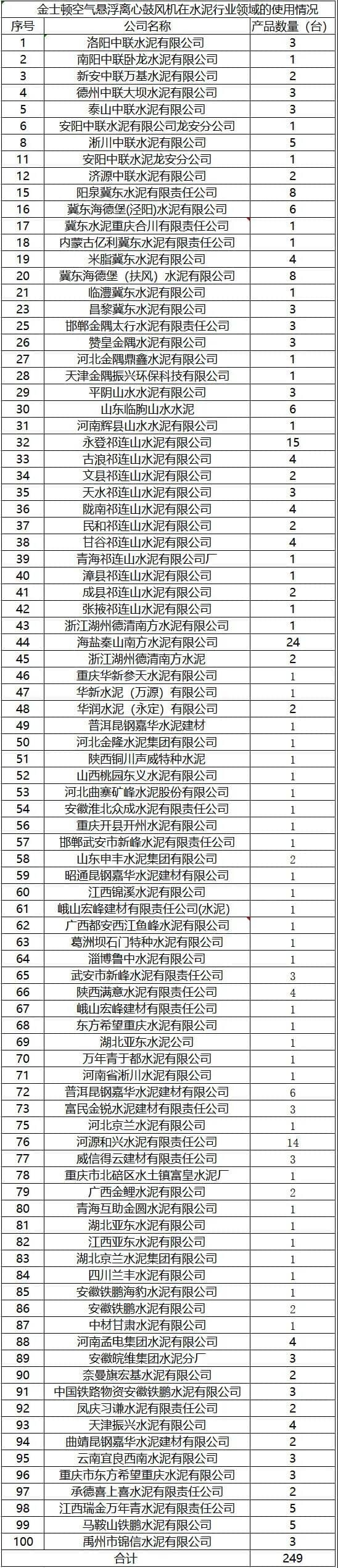 自金隅太行成功的使用了兩臺空氣懸浮風機后,更多的水泥企業(yè)開始嘗試使用金士頓空氣懸浮風機。據(jù)水泥人網不完全統(tǒng)計,截止目前水泥行業(yè)領域共有249臺金士頓空氣懸浮風機投入使用,金隅冀東,祁連山水泥,山水水泥,南方水泥,中聯(lián)水泥,東方希望水泥,華新水泥,昆鋼嘉華,曲寨水泥,京蘭水泥、亞東水泥等均有上線金士頓空氣懸浮風機。