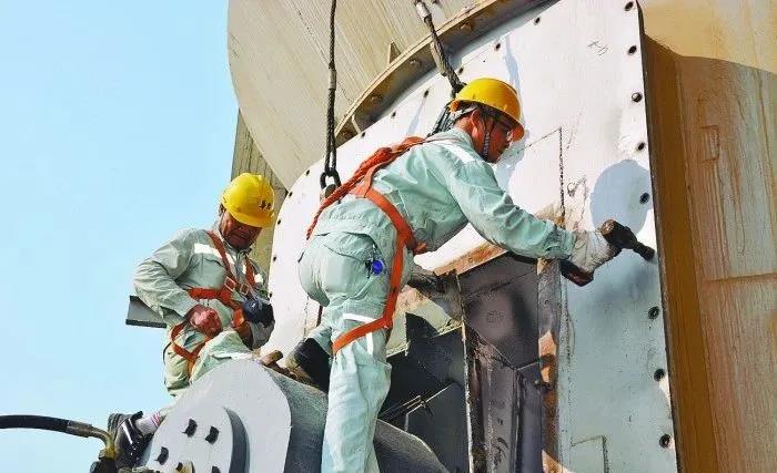 工人們戴著安全設(shè)備,在高空對(duì)立磨進(jìn)行檢修