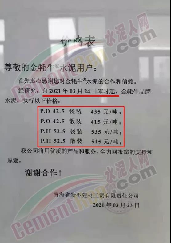青海省新型建材工貿(mào)有限責任公司通知自3月24日零時起,金牦牛品牌水泥執(zhí)行新價格,PO42.5散裝報價415元/噸,P.II52.5散裝水泥報價515元/噸。