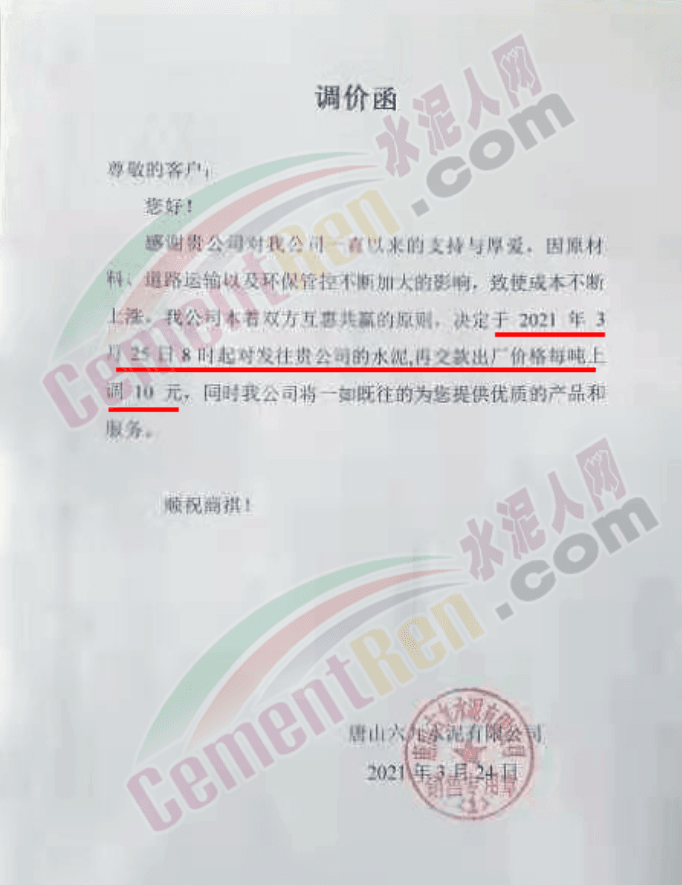 金隅冀東水泥(唐山)有限責任公司營銷分公司通知,由于企業(yè)環(huán)保投入、原材料成本不斷增加,致使水泥成本不斷提高。為保證企業(yè)正常運營,對水泥的出廠價格進行調(diào)整,自2021年3月25日14時起,天津地區(qū)各品種散裝水泥和袋裝水泥出廠價格在原價格基礎上上調(diào)20元/噸。