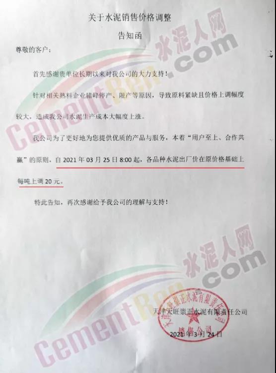 天津天旺崇正水泥有限責任公司通知自3月25日8時起,各品種水泥出廠價在原價格基礎上上調(diào)20元/噸。