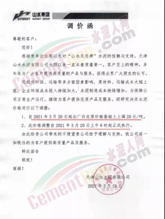 天津山水水泥有限公司通知,自3月20日起各標號水泥出廠價上調(diào)20元/噸。