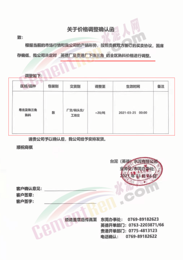 同期,英德臺泥也通知上調(diào)英德廠及貴港廠下珠三角的全區(qū)熟料價格20元/噸。