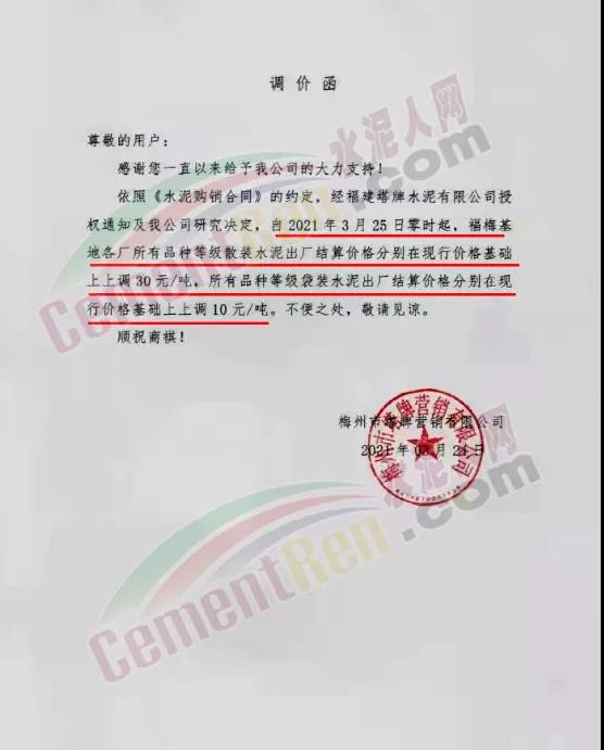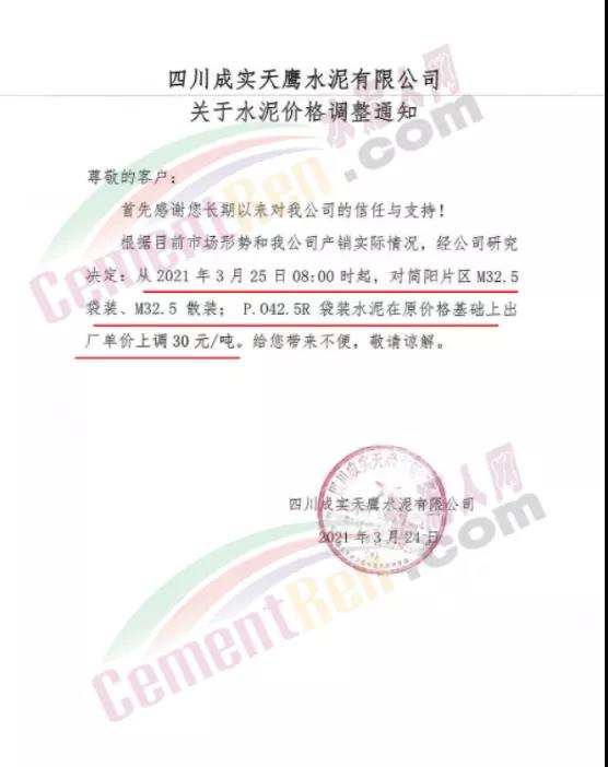 近期,因市場原因,經(jīng)研究決定,自2021年3月26日零時起,各品種散、袋水泥在原有價格基礎上上調(diào)30元/噸。