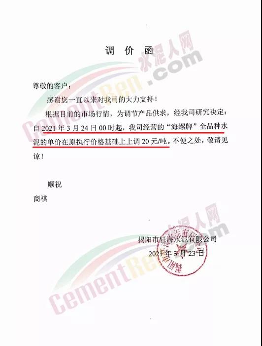 揭陽市軒海水泥有限公司通知,自3月24日零時起,公司經(jīng)營的“海螺牌”全品種水泥上調(diào)20元/噸。