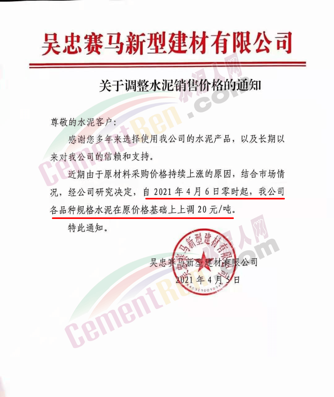 寧夏吳忠賽馬新型建材有限公司通知,由于原材料采購(gòu)價(jià)格持續(xù)上漲的原因,結(jié)合市場(chǎng)情況,經(jīng)公司研究決定 ,自4月6日零時(shí)起,公司各品種規(guī)格水泥在原價(jià)基礎(chǔ)上上調(diào)20元/噸。