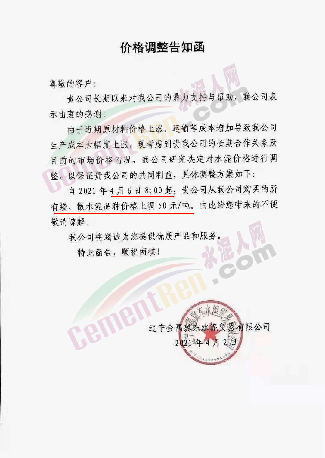 遼寧金隅冀東水泥貿(mào)易公司通知,由于近期原材料價(jià)格上漲,運(yùn)輸?shù)瘸杀驹黾訉?dǎo)致公司生產(chǎn)成本大幅度上漲,經(jīng)公司研究決定對(duì)水泥價(jià)格進(jìn)行調(diào)整,自4月6日8時(shí)起,貴公司從我公司購(gòu)買(mǎi)的所有袋、散水泥品種價(jià)格上調(diào) 50元/噸。