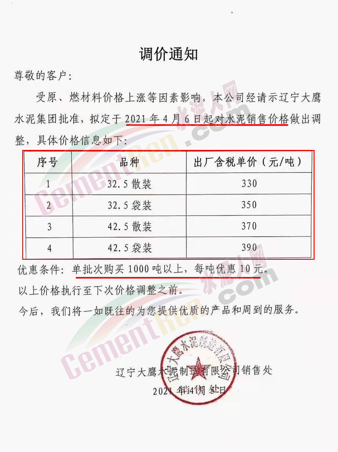 遼寧大鷹水泥制造有限公司銷(xiāo)售處通知,受原、燃材料價(jià)格上漲等因素影響,定于4月6日起對(duì)水泥銷(xiāo)售價(jià)格做出調(diào)整。調(diào)整后32.5袋裝水泥出廠含稅價(jià)350元/噸,42.5散裝水泥出廠含稅價(jià)370元/噸。單次購(gòu)買(mǎi)1000噸以上,優(yōu)惠10元/噸。