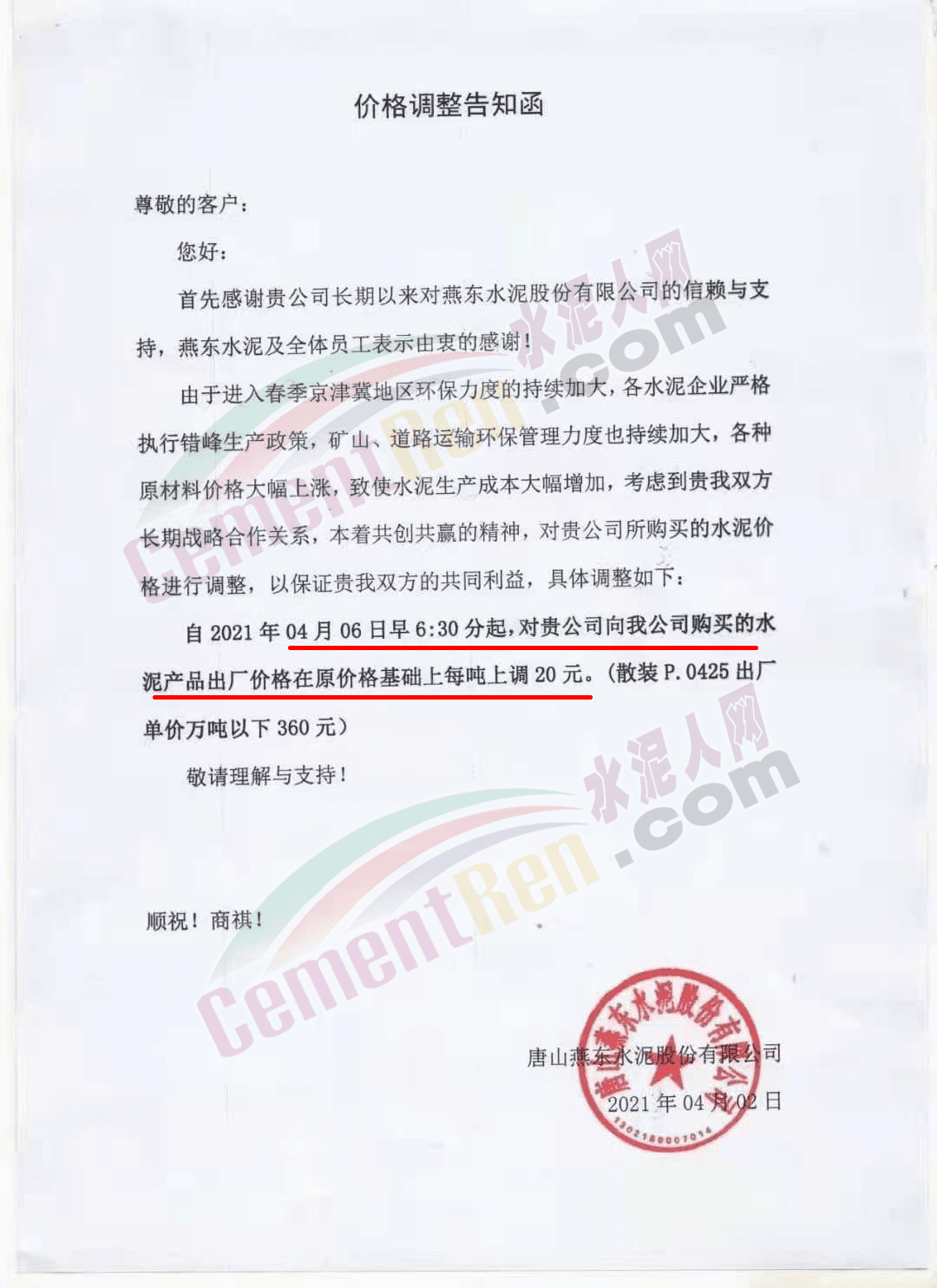 尊敬的客戶(hù):根據(jù)目前市場(chǎng)行情,經(jīng)公司研究決定,自2021年4月8日零時(shí)起我司發(fā)往各區(qū)域的各品種各型號(hào)水泥出廠單價(jià)上調(diào)40元/噸 。