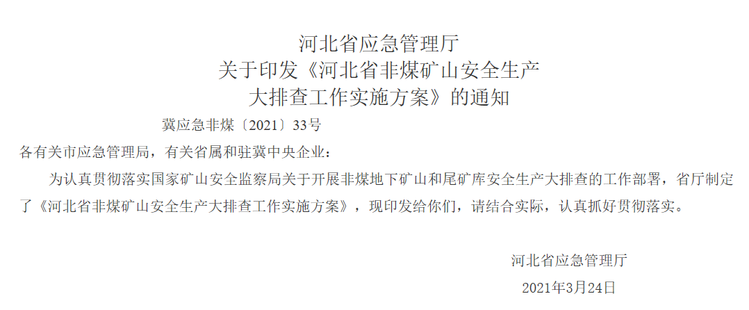 特別是要聚焦當前突出問題和重點工作,按照《河北省應急管理廳關(guān)于貫徹落實全國礦山安全生產(chǎn)視頻會議精神進一步加強當前非煤礦山安全生產(chǎn)工作的緊急通知》(冀應急非煤〔2021〕20號)要求,