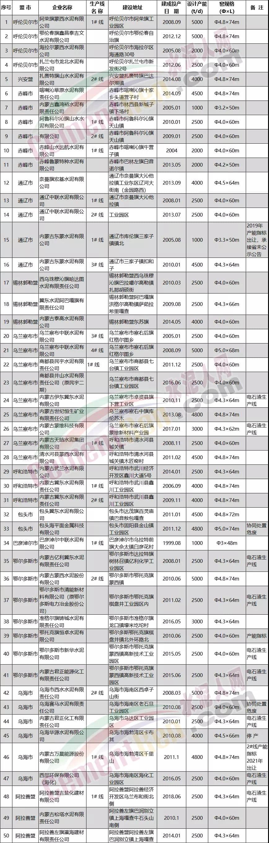 日前,內(nèi)蒙古工信廳公開了全區(qū)水泥熟料生產(chǎn)線清單截止時間為2020年12月31日。清單顯示,內(nèi)蒙自治區(qū)46家水泥企業(yè)50條熟料生產(chǎn)線,合計產(chǎn)能達4692萬噸。