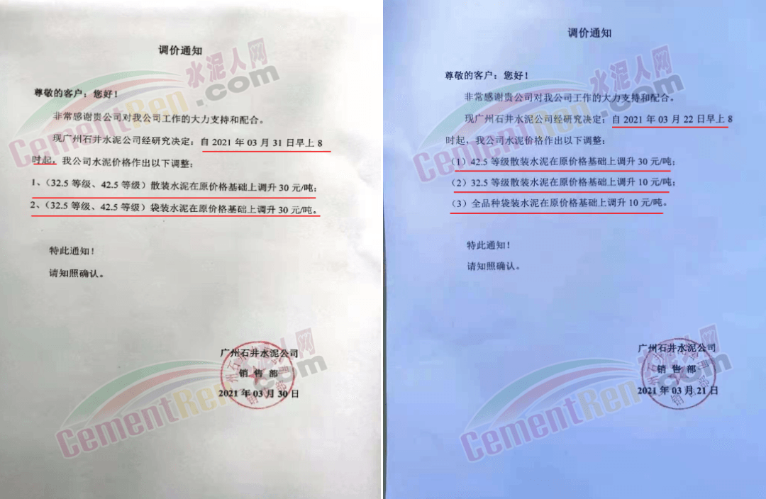 羅浮山水水泥集團(tuán)惠州國(guó)強(qiáng)水泥有限公司、博羅縣浮山水泥有限公司、惠州羅浮山旋窯水泥有限公司、惠州寶湖建材制造有限公司、惠州市惠陽(yáng)雙新水泥有限公司等多家企業(yè)陸續(xù)通知上調(diào)各標(biāo)號(hào)水泥價(jià)格30元/噸。部分企業(yè)調(diào)價(jià)通知如下: