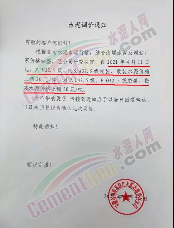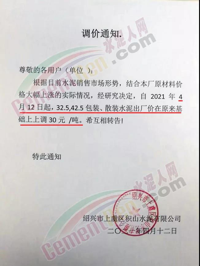 4月11日,紹興市上虞區(qū)積山水泥有限公司通知自4月12日起各標(biāo)號(hào)水泥在原價(jià)基礎(chǔ)上上調(diào)30元/噸。