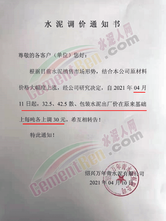4月10日,紹興萬(wàn)年青水泥有限公司通知根據(jù)目前水泥銷售市場(chǎng)形勢(shì),結(jié)合本公司原材料價(jià)格大幅度上漲,經(jīng)公司研究決定,自4月11日起,32.5、42.5散、包裝水泥出廠價(jià)在原來(lái)基礎(chǔ)上每噸各上調(diào)30元。